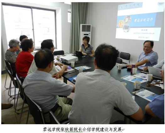 翔英学院彭章友副经理介绍了翔英学院的发展情况,学院的专业设置,员工的培养按3+1模式进行,课程设置要求员工每门课程要求按项目组来完成,实行书院制,培养员工具有爱国、创新、国际化意识和相关能力,表示希望与君远学院建立更为密切的关系,并代表翔英学院经理邀请君远学院张经理到上海翔英学院参观、访问。